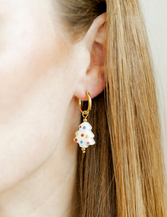 • Gold hoop earrings with white tree-shaped charms featuring colorful dots on a white background