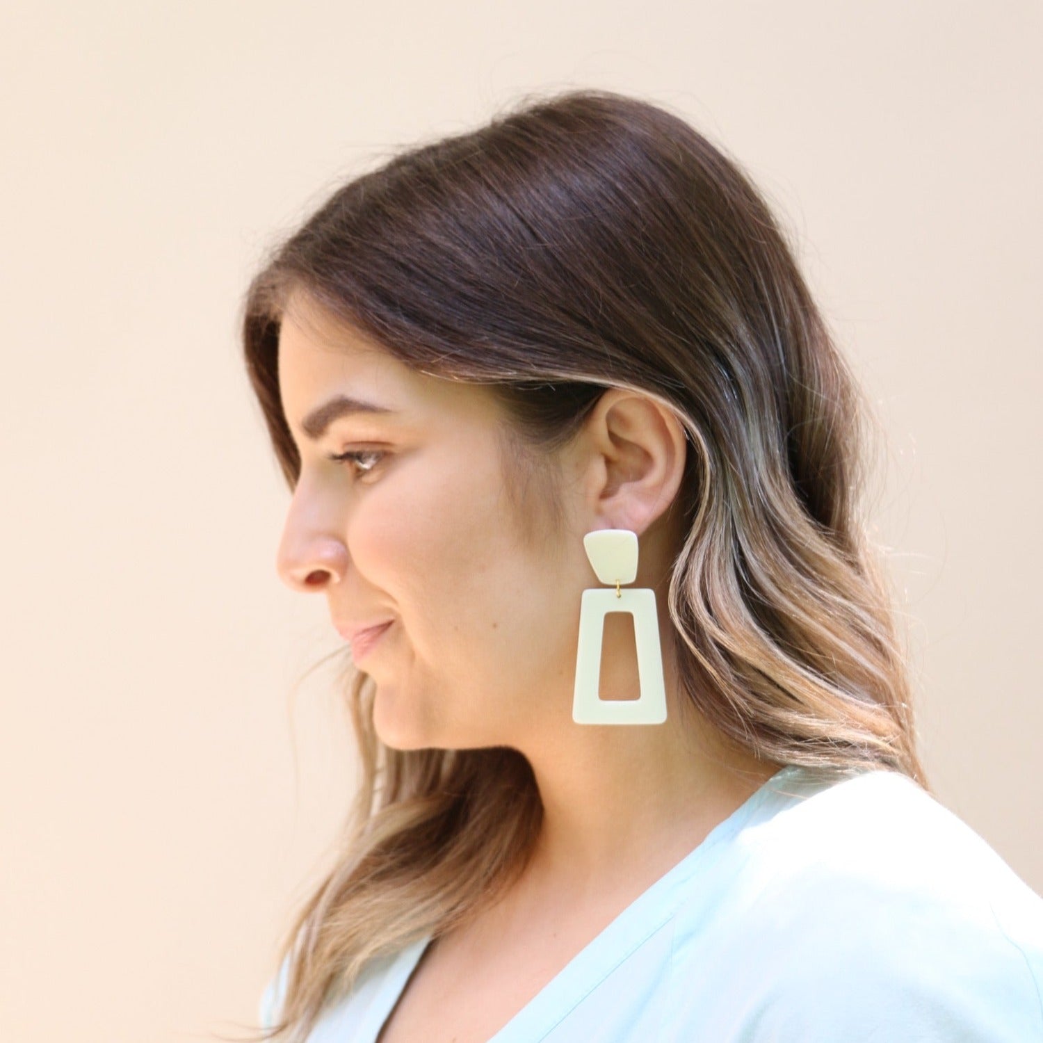 The Kennedy Statement Earrings in Key Lime Pie offer a vibrant and refreshing touch to any outfit. These 70mm earrings feature a bold geometric design in a solid light green color with a glossy finish, making them a playful and chic accessory. Crafted from 100% surgical-grade stainless steel and eco-friendly acetate, these earrings are lightweight, durable, and hypoallergenic, ensuring comfort for sensitive ears. As a LINNY CO staple piece, the Kennedy earrings seamlessly combine elegance and fun, making them perfect for various occasions.
