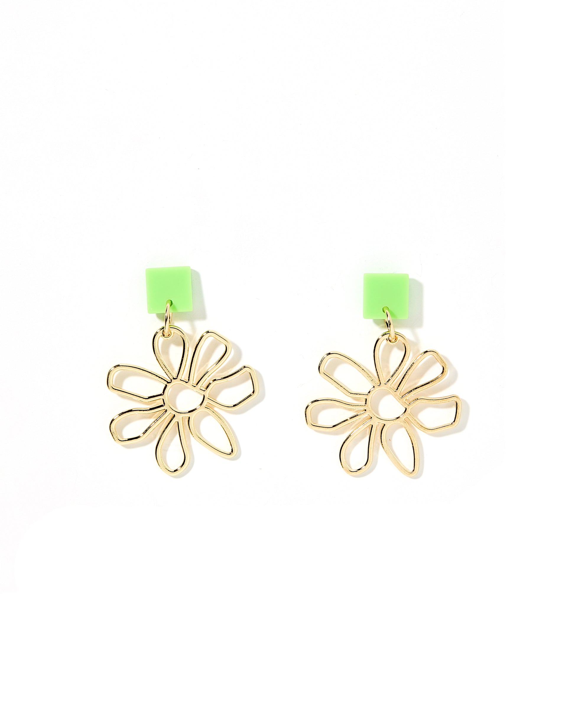 The Daisy earring has a gold-plated alloy flower, is 45mm long and is connected to a colorful square. A beautiful flower earring with many color options to choose from.