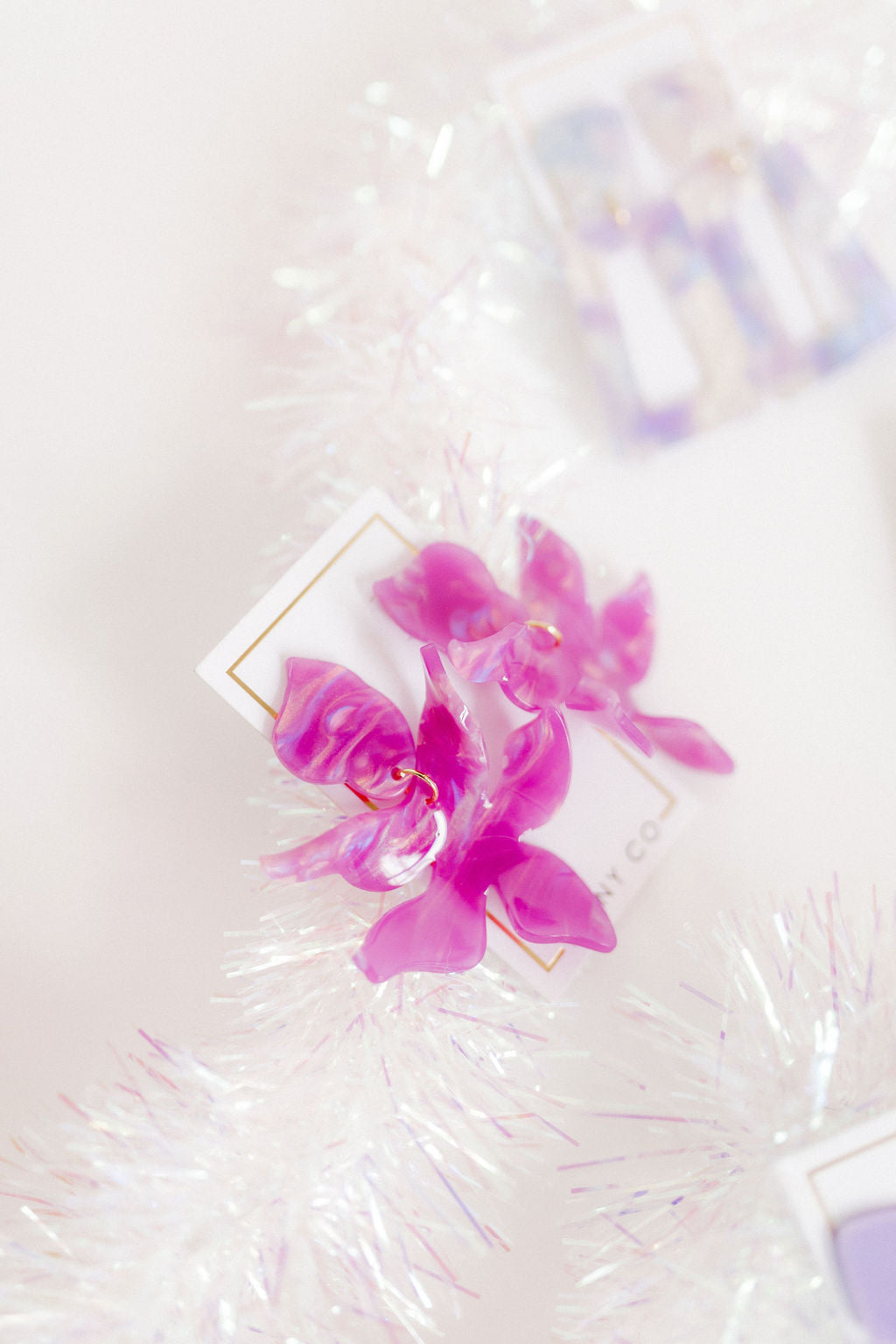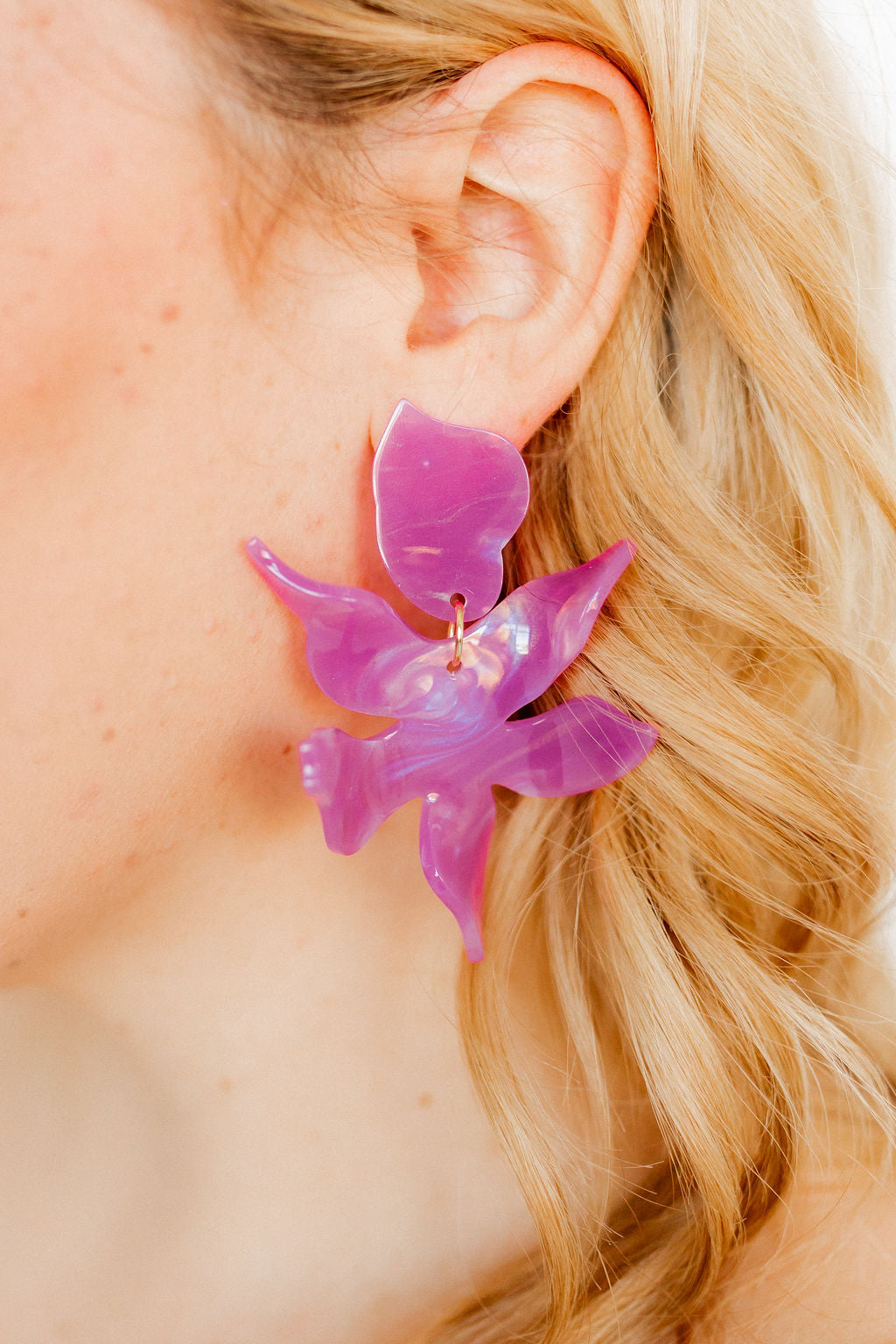 Turn heads with the Flora Statement Earrings in Orchid Purple! These oversized earrings, measuring 80mm in length, are designed to add a bold and playful flair to your look. The vibrant magenta-purple hue with iridescent accents makes them a perfect accessory for any outfit.