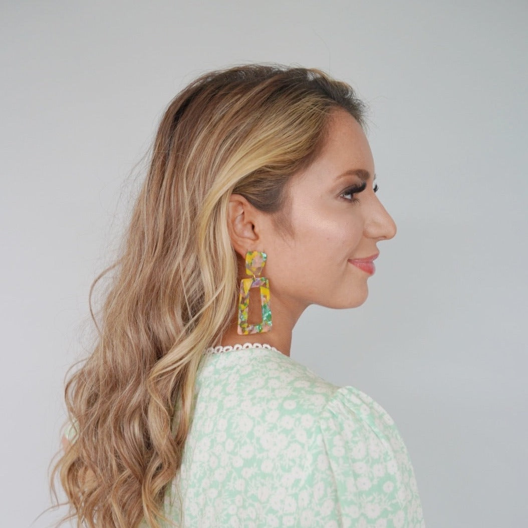 Make a bold, colorful statement with the Kennedy Statement Earrings in Pink-Green Confetti. These 70mm earrings feature a striking geometric design, with a vibrant mix of peach, purple, yellow, and green confetti, accented with pops of metallic, all set in a glossy finish. Crafted from 100% surgical-grade stainless steel and eco-friendly acetate, these earrings are lightweight, durable, and safe for sensitive ears. As a LINNY CO staple piece, the Kennedy earrings add a playful, eye-catching touch to any outfit, perfect for elevating your style for any occasion.