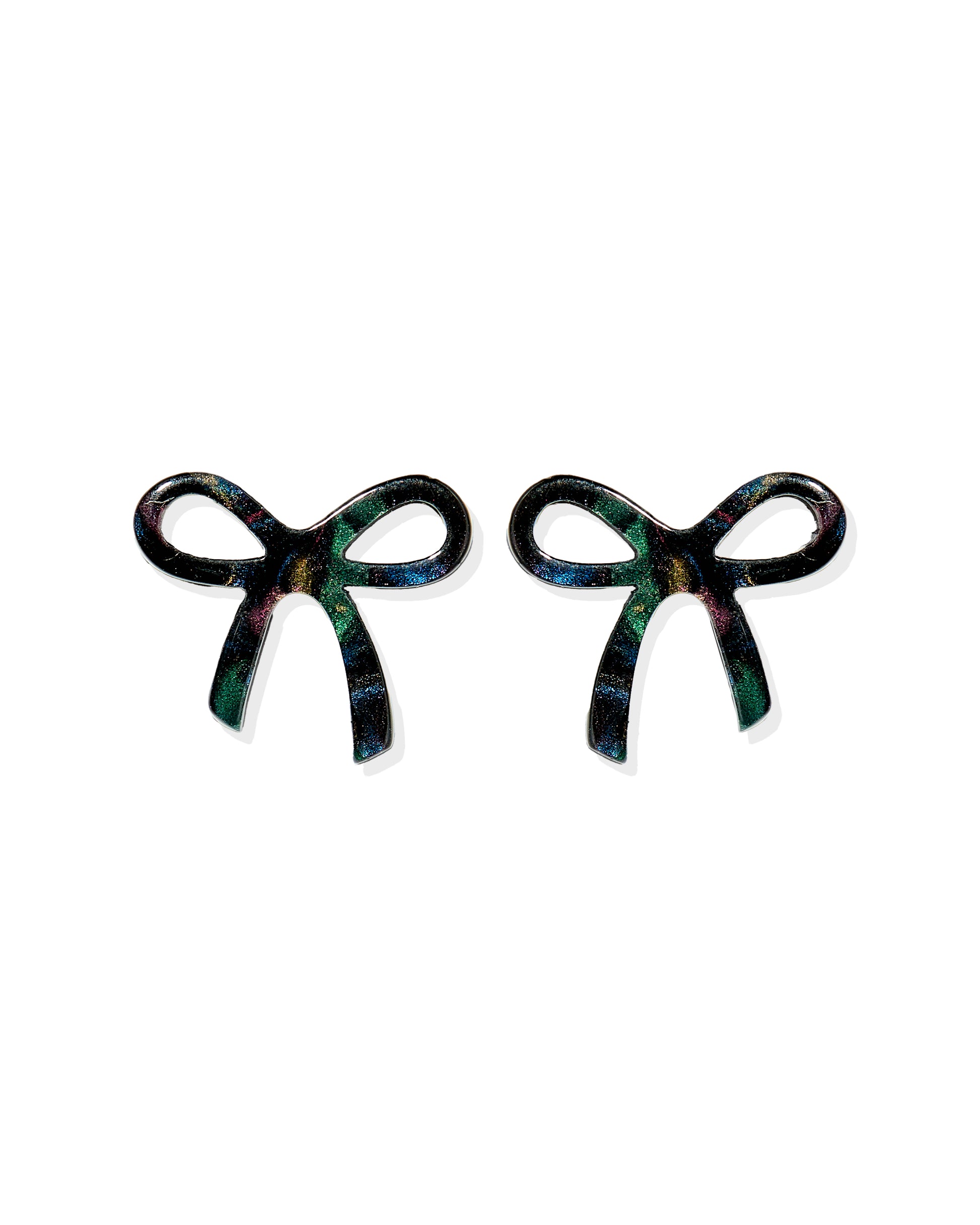 The Kylie Bow Earrings in Black Iridescent bring a touch of understated elegance with their sophisticated design. These 25mm acetate bows feature a sleek black base with subtle iridescent marbling, creating a refined yet eye-catching effect. Mounted on stainless steel earring posts, they offer durability, comfort, and hypoallergenic qualities, making them safe for sensitive ears. Whether dressing up for a formal event or adding elegance to your everyday attire, these earrings are the perfect blend of simplicity and shimmer.