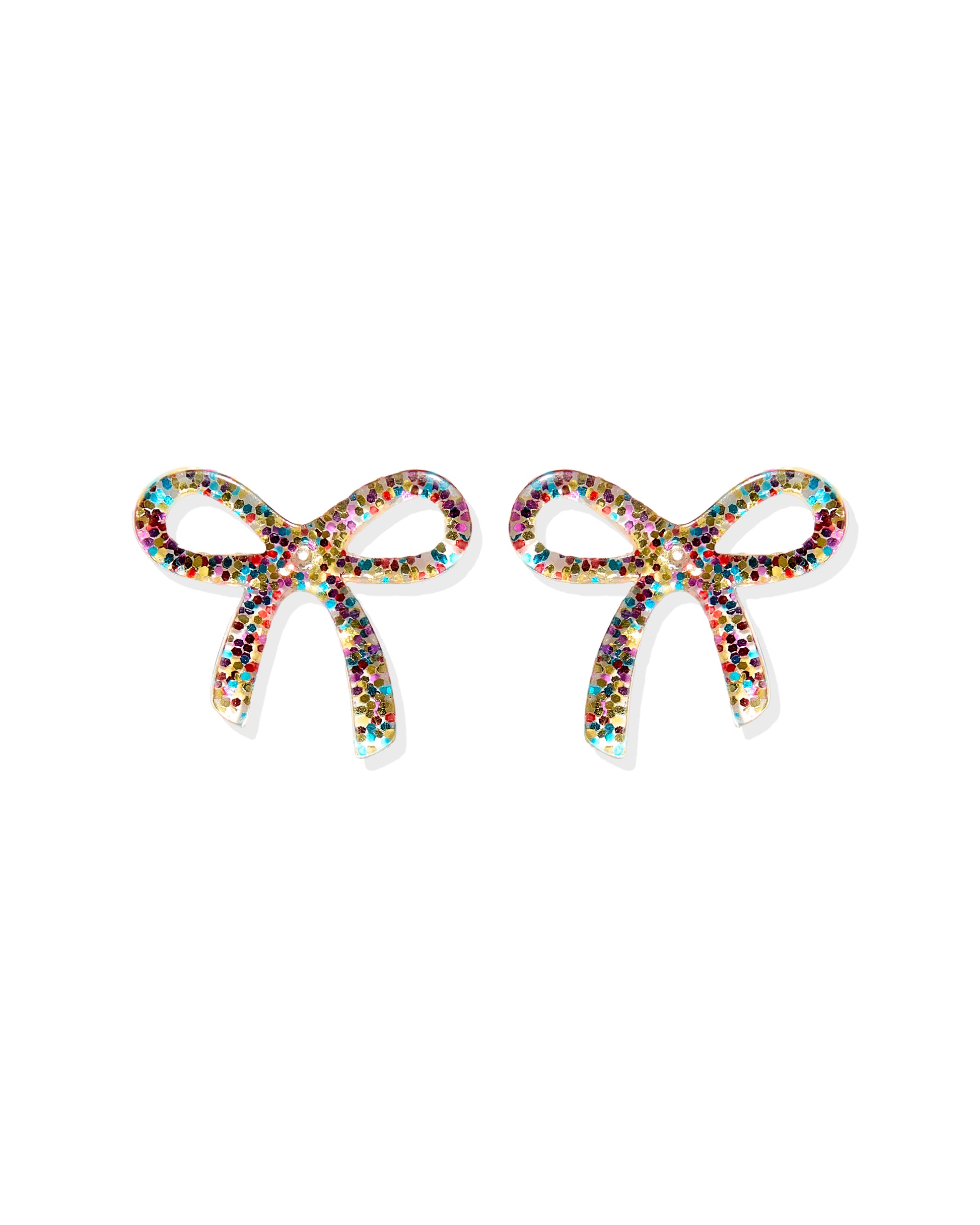 The Kylie Bow Earrings in Multi Glitter add a vibrant touch to any ensemble with their sparkling, multi-colored glitter design. These 25mm acetate bows feature a transparent base filled with colorful glitter and a glossy finish, offering a fun and eye-catching look. Mounted on stainless steel earring posts, these earrings are lightweight, durable, and hypoallergenic, making them safe for sensitive ears. Perfect for adding a playful yet sophisticated touch to both casual and evening outfits, these earrings are a versatile and chic addition to any jewelry collection.