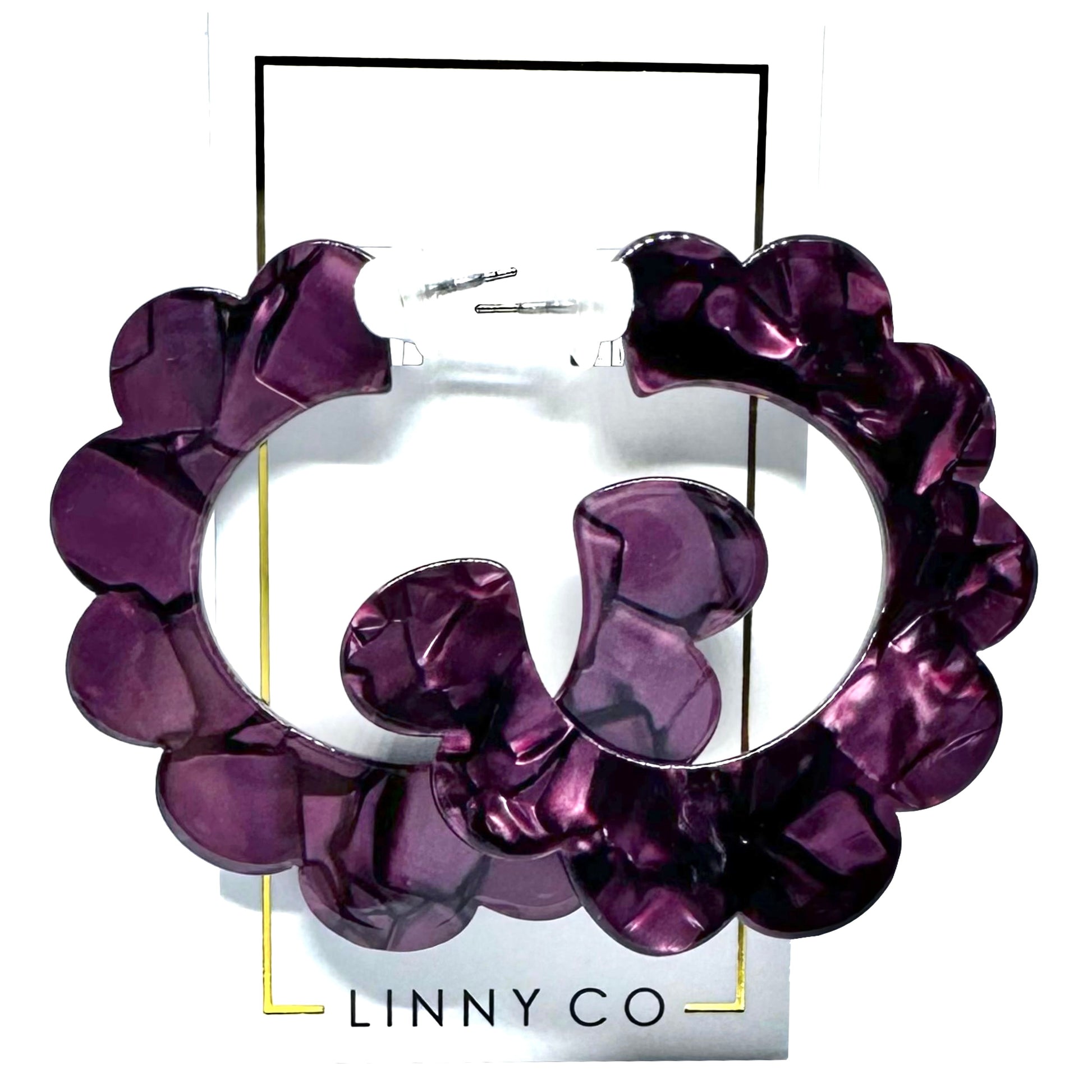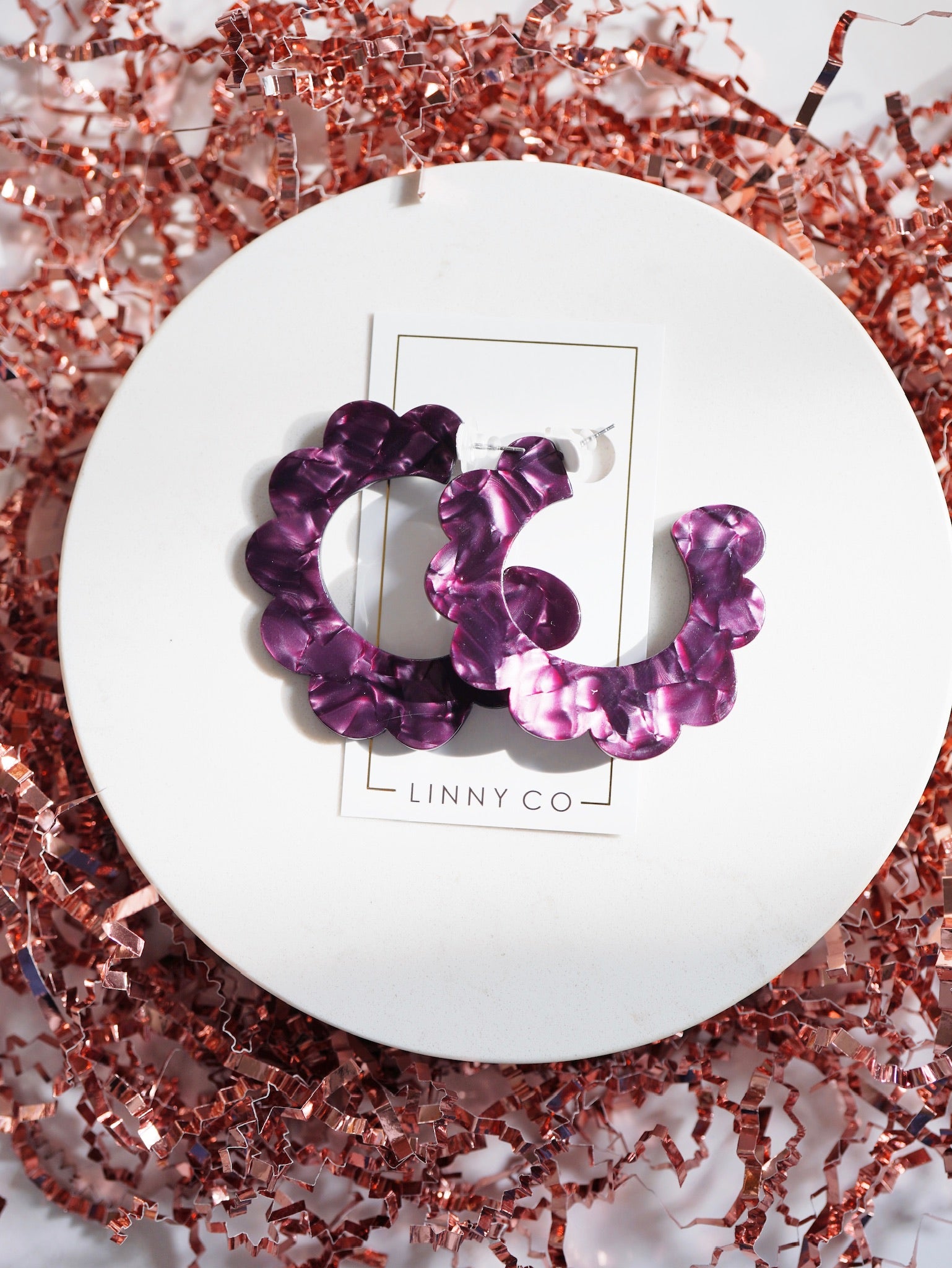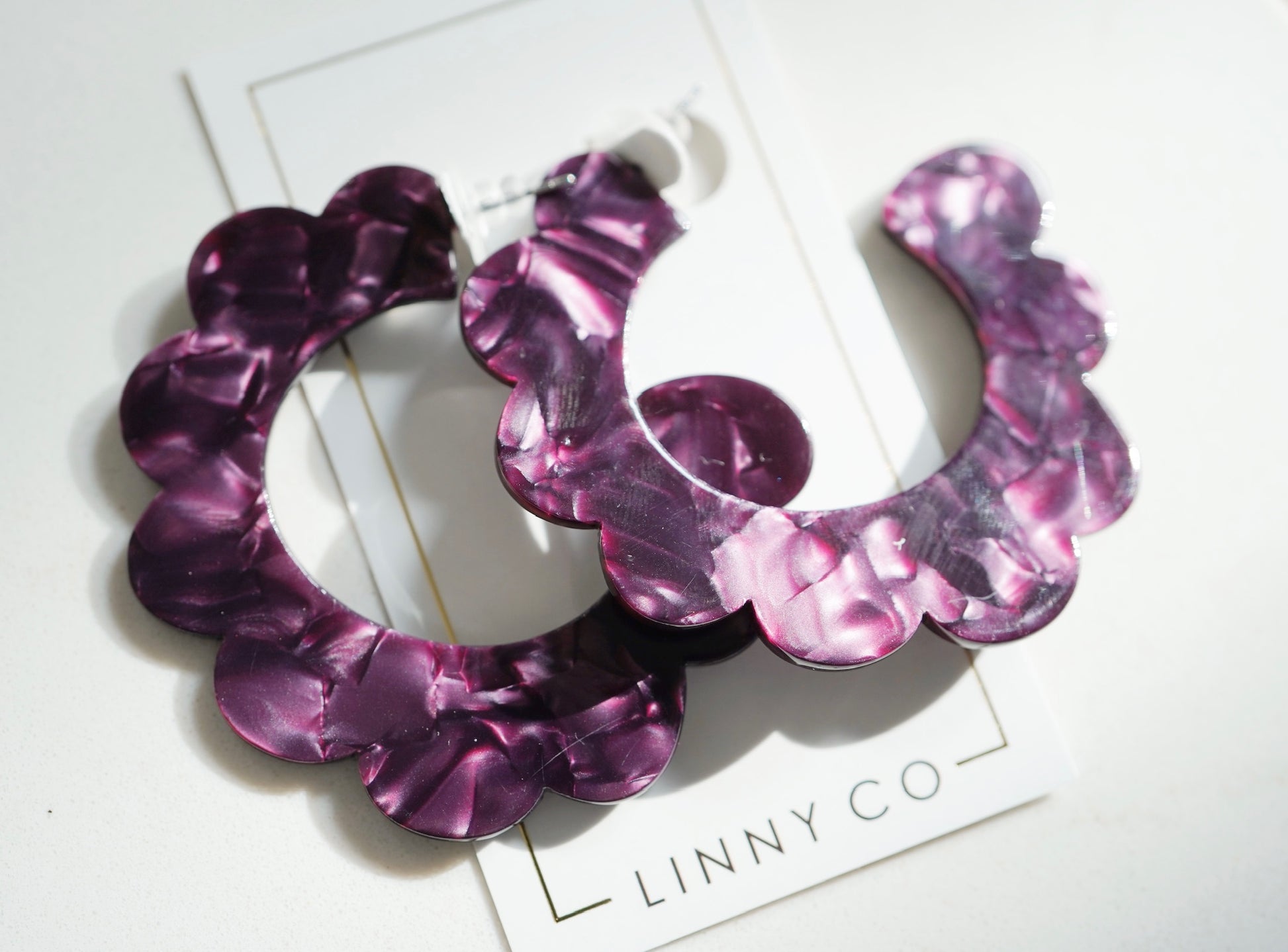 The Margo Pearlized Plum Earrings feature a stunning metallic dark purple hue with a beautiful pearlized finish, giving these 60mm scalloped hoops a unique and luxurious look. Designed by LINNY, these earrings combine sophistication and boldness with a touch of character. Made from 100% surgical-grade stainless steel and eco-friendly acetate, they are lightweight, durable, and hypoallergenic, perfect for sensitive ears.