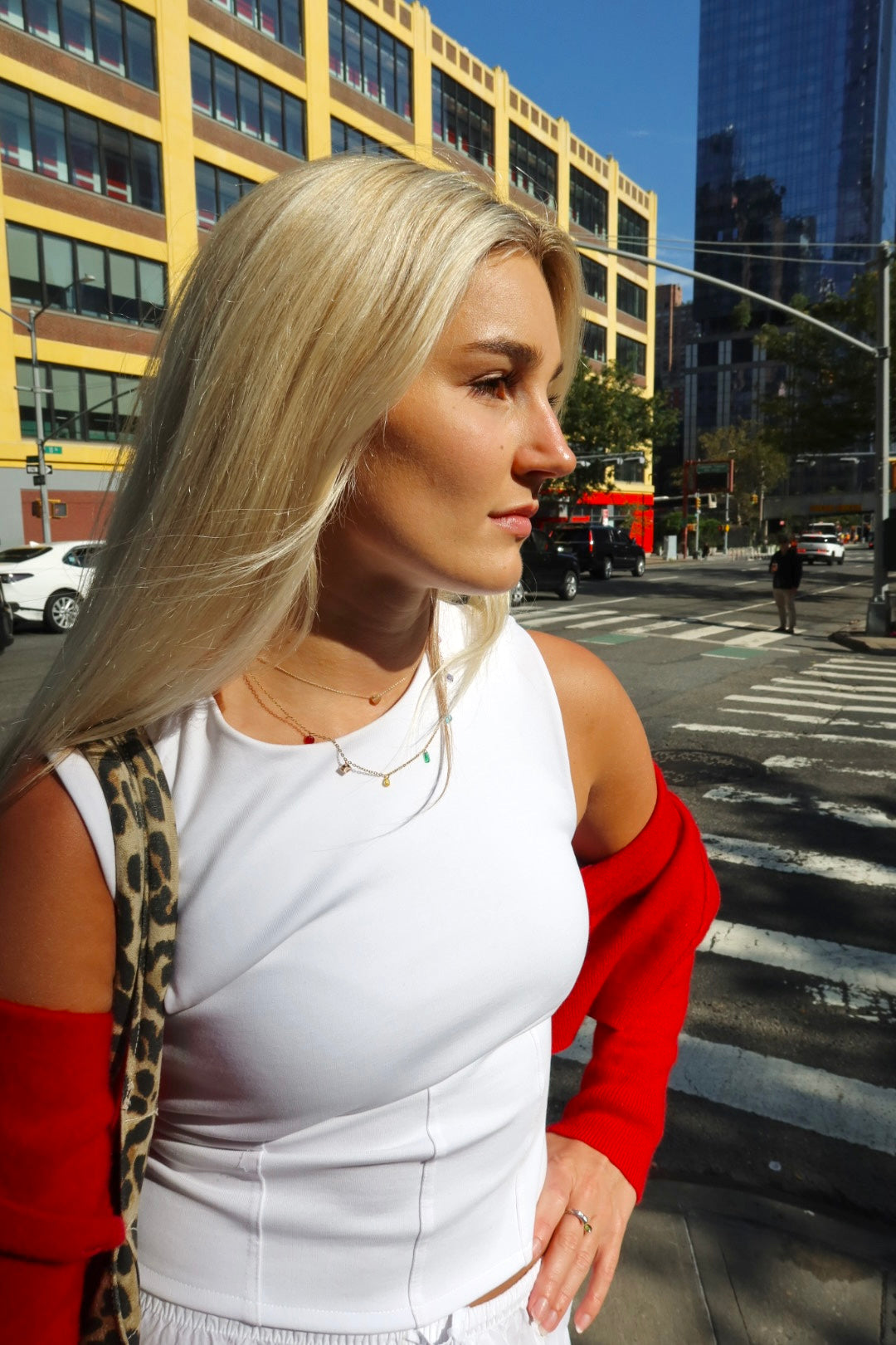 Bring color and charm to your look with the Allegra Multi Necklace. Featuring a mix of vibrant stones in playful shapes and hues, this necklace is set on a delicate 16–18 inch adjustable gold chain for the perfect fit. Designed to brighten any outfit, it’s a versatile statement piece that transitions effortlessly from daytime outings to evening occasions.