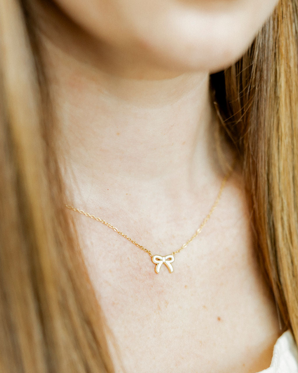 - Thin gold bow pendant with white accent