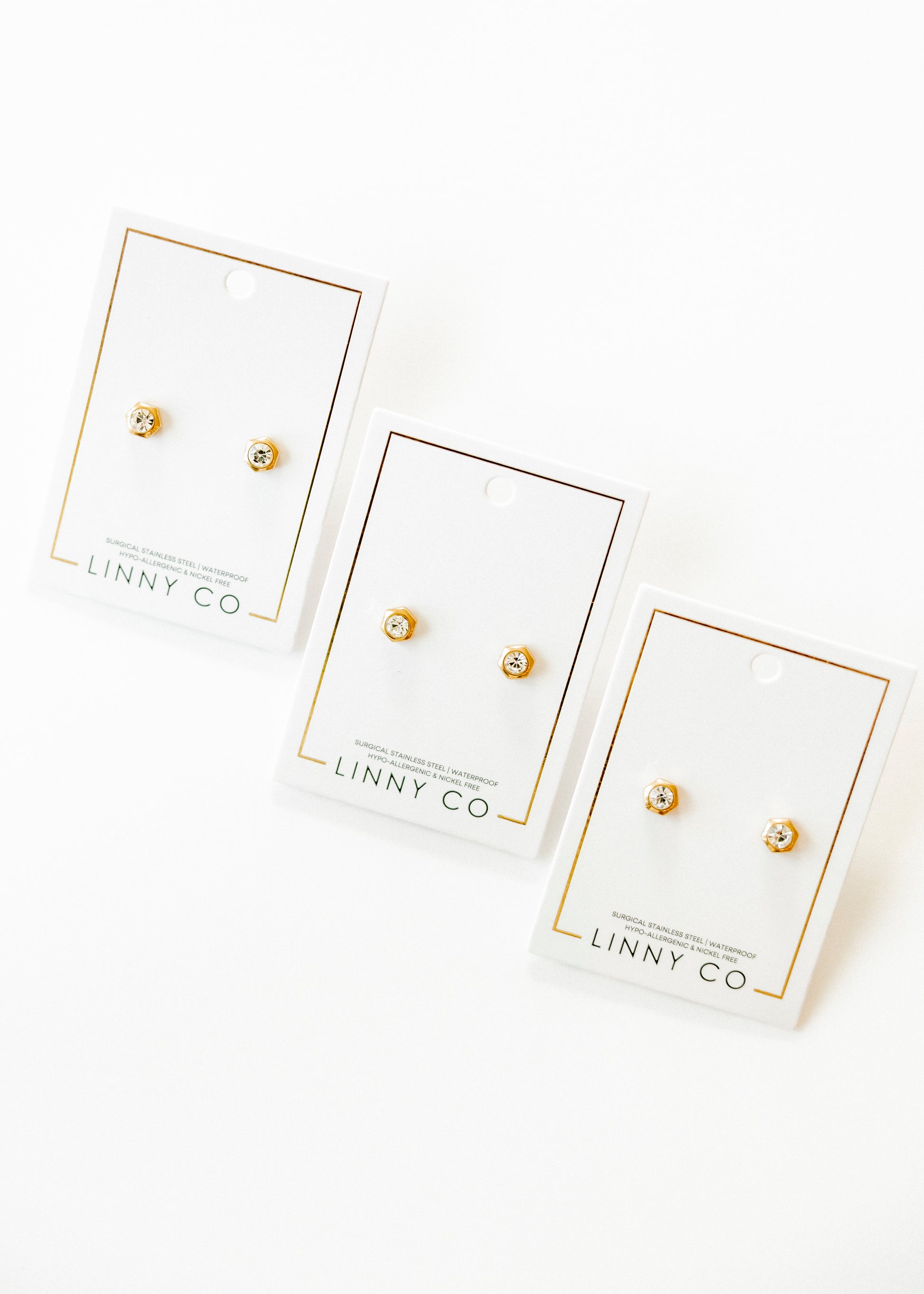 These Addison Clear CZ Stone Stud Earrings offer a sleek, minimalist design with a thin gold hexagon shape and a clear CZ stone embedded at the center. Crafted from 100% surgical-grade stainless steel, these earrings are both lightweight and durable, making them the perfect waterproof staple for everyday wear. The innovative screwback design ensures a secure and snug fit, making them comfortable and easy to wear.
