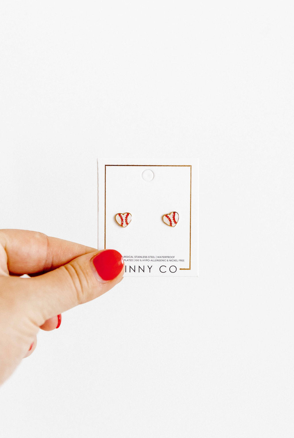 The heart-shaped enamel design features a playful baseball pattern in red and white, making these earrings a perfect addition for sports enthusiasts or anyone looking to add a fun, sporty touch to their look.