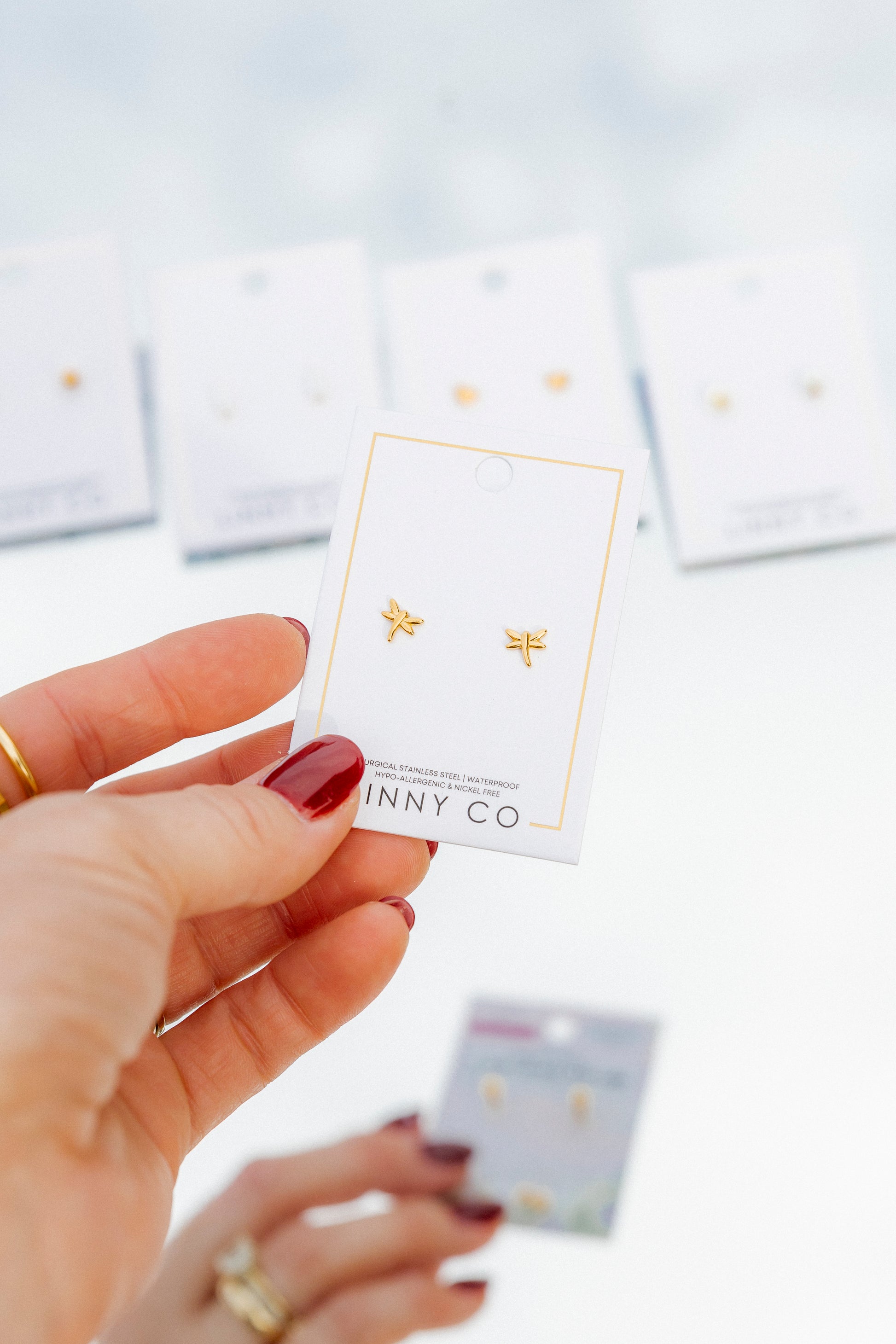 A symbol of transformation and joy, the Dragonfly Screw-Back Stud Earrings bring a whimsical, nature-inspired touch to everyday style. Crafted in a polished gold finish and designed with hypoallergenic materials, these tiny wings are perfect for stacking or wearing solo. Waterproof, tarnish-resistant, and comfortable enough to sleep in — they’re made for everyday adventure.