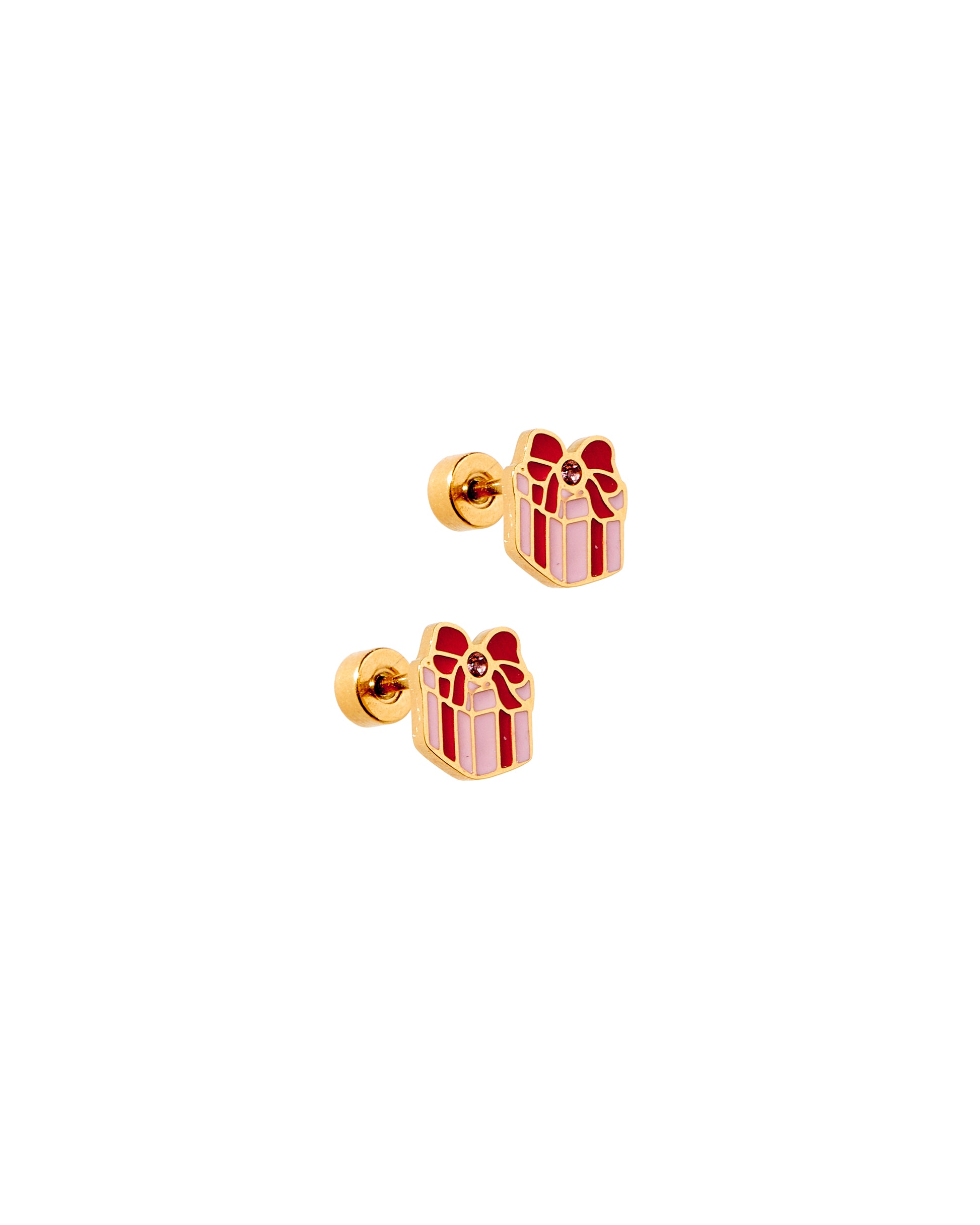Add a cheerful pop of holiday color with the Present Screwback Stud Earrings. Measuring 8mm x 7mm, these adorable studs feature a pink and red gift box design accented with a sparkling CZ detail at the bow. Festive yet chic, they bring a playful touch of holiday spirit to any look while offering all-day comfort with their secure screw-on flat backs.