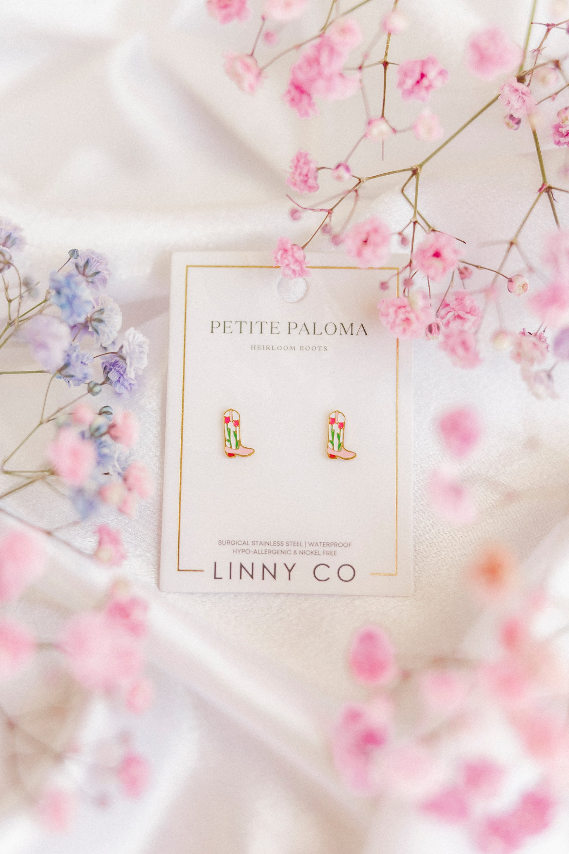 The Screwback Stud Earrings - Tulip Cowgirl Boot are inspired by Petite Paloma's best-selling Sadie Boot. These 10mm earrings feature a boot design with a delicate tulip detail, offering a charming and playful western look. The screw back earrings ensure a secure and comfortable fit, making them perfect for all-day wear. Hypoallergenic and lightweight, these earrings are ideal for both teens and adults.