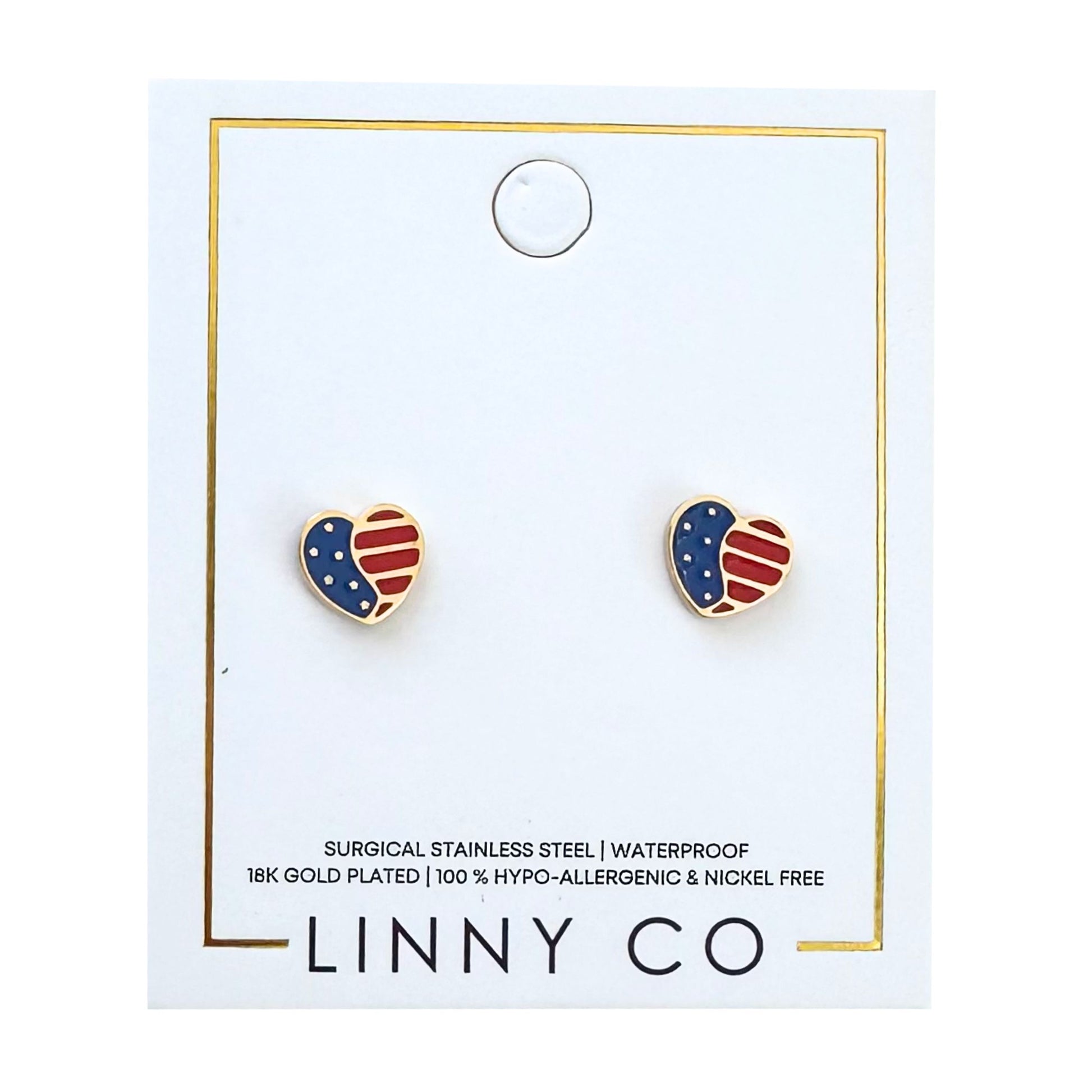 Show your patriotic spirit with the Gold Heart with American Flag Enamel Screwback Stud Earrings. These 8mm studs feature a gold heart design with vibrant American flag-inspired enamel embossing, making them a unique and bold accessory. The secure screwback design ensures they stay comfortably in place all day, making them perfect for everyday wear.