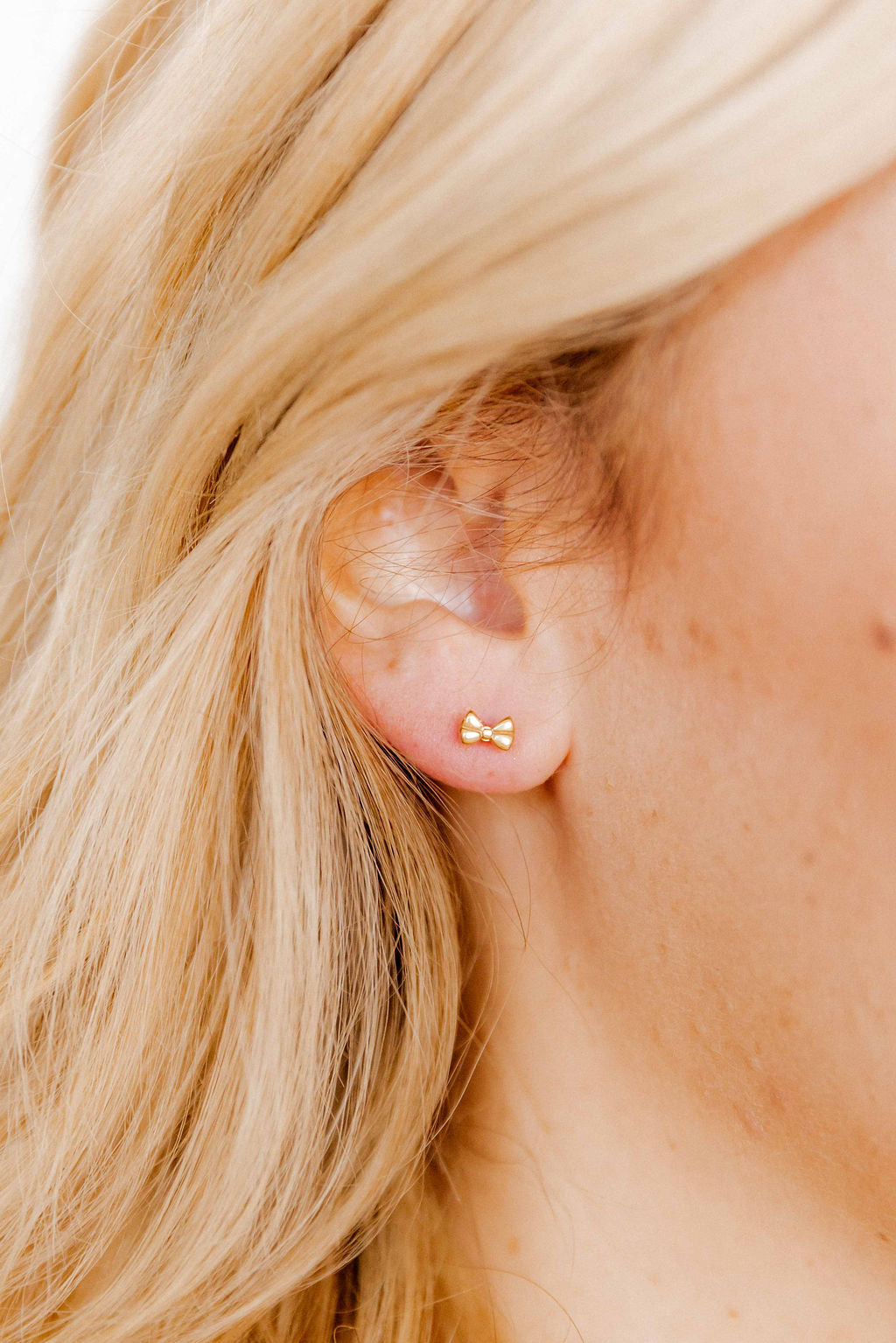 Elevate your accessory game with the Screwback Stud Earrings - Tori. These tiny 6mm studs feature a glossy gold bow design, offering a charming yet subtle touch to any look. Expertly crafted from premium surgical-grade stainless steel, these earrings combine durability and elegance. Their secure screwback design ensures a snug and comfortable fit, making them perfect for everyday wear. Waterproof and lightweight, these earrings are perfect for offering a stylish yet practical accessory for all occasions. Hypoallergenic and nickel-free, these studs are safe for sensitive ears.