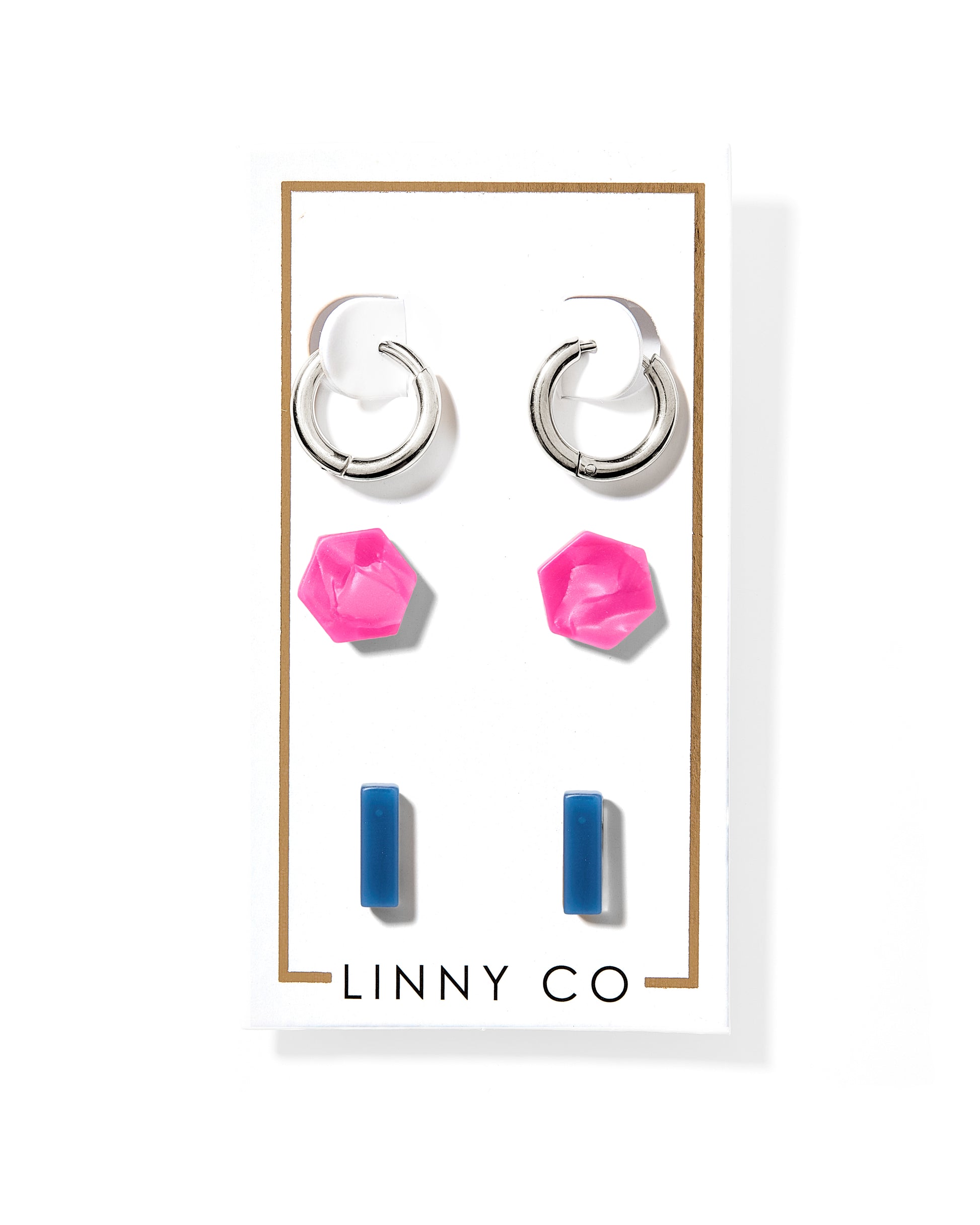 Bring a burst of color to your jewelry collection with the Stud Trio - Summer. This set features a 10mm silver huggie, a Magenta hexagon, and a Navy bar, each crafted with eco-friendly acetate and 100% surgical-grade stainless steel posts. These lightweight, hypoallergenic studs are perfect for sensitive ears and provide a playful yet elegant combination of styles. With all studs measuring 12mm or smaller, the Summer Trio is a versatile addition to any jewelry box or makes a thoughtful gift.