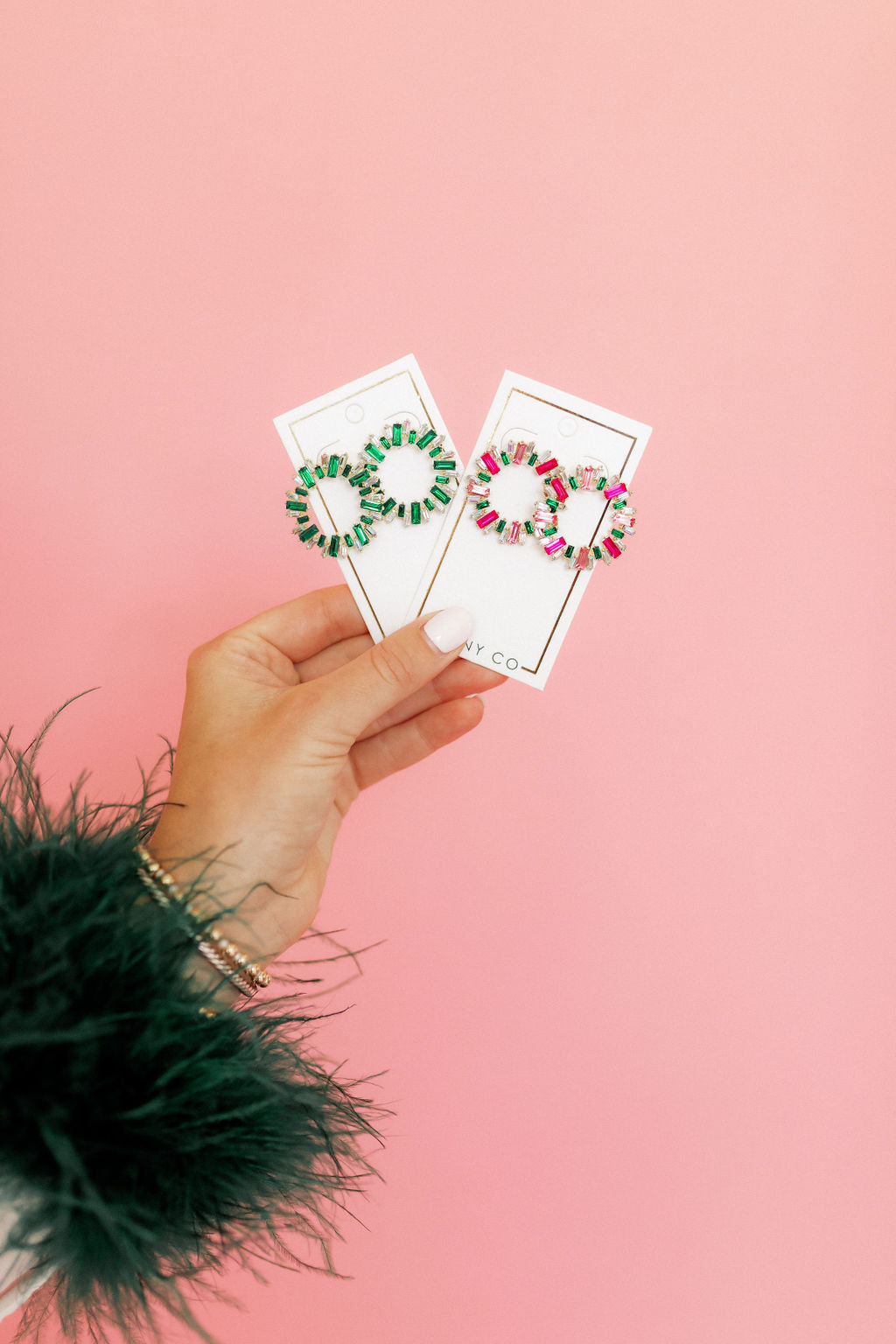 Whitney is 35mm. Shaped in a circle and made of multi-colored cz stones, this earring adds the perfect amount of sparkle and fun to any outfit.